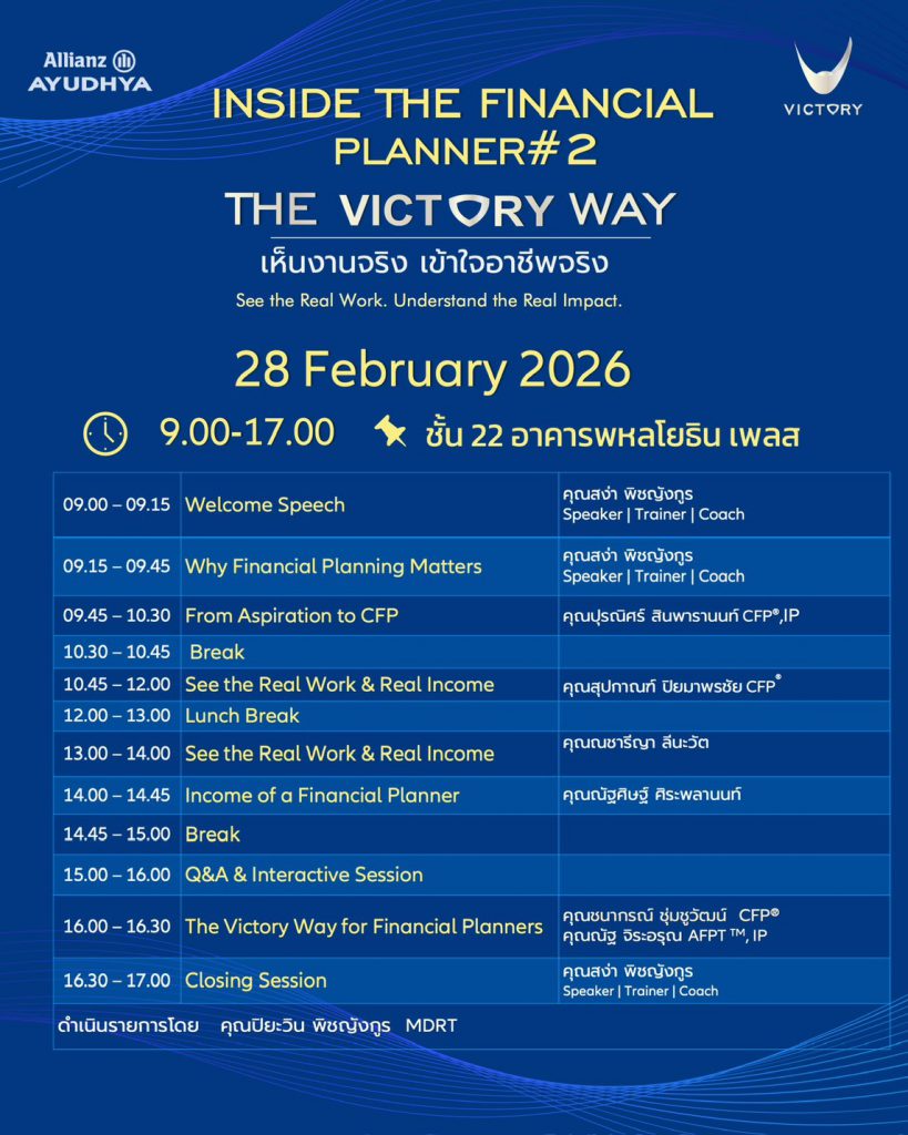 ความแตกต่างระหว่างนักวางแผนการเงินที่ “อยู่รอด” กับ “รุ่งโรจน์” คือ Victory System ไม่ได้สอนแค่ให้คุณทำงานหนัก แต่สอนให้คุณทำงานอย่างมีกลยุทธ์ ผ่านกระบวนการที่เป็นมืออาชีพ สถาบันการเงินชั้นนำอย่าง Allianz Ayudhya และทีมผู้เชี่ยวชาญระดับแนวหน้าจะมาเผย Blueprint ที่ใช้สร้างความสำเร็จซ้ำแล้วซ้ำเล่าได้จริง